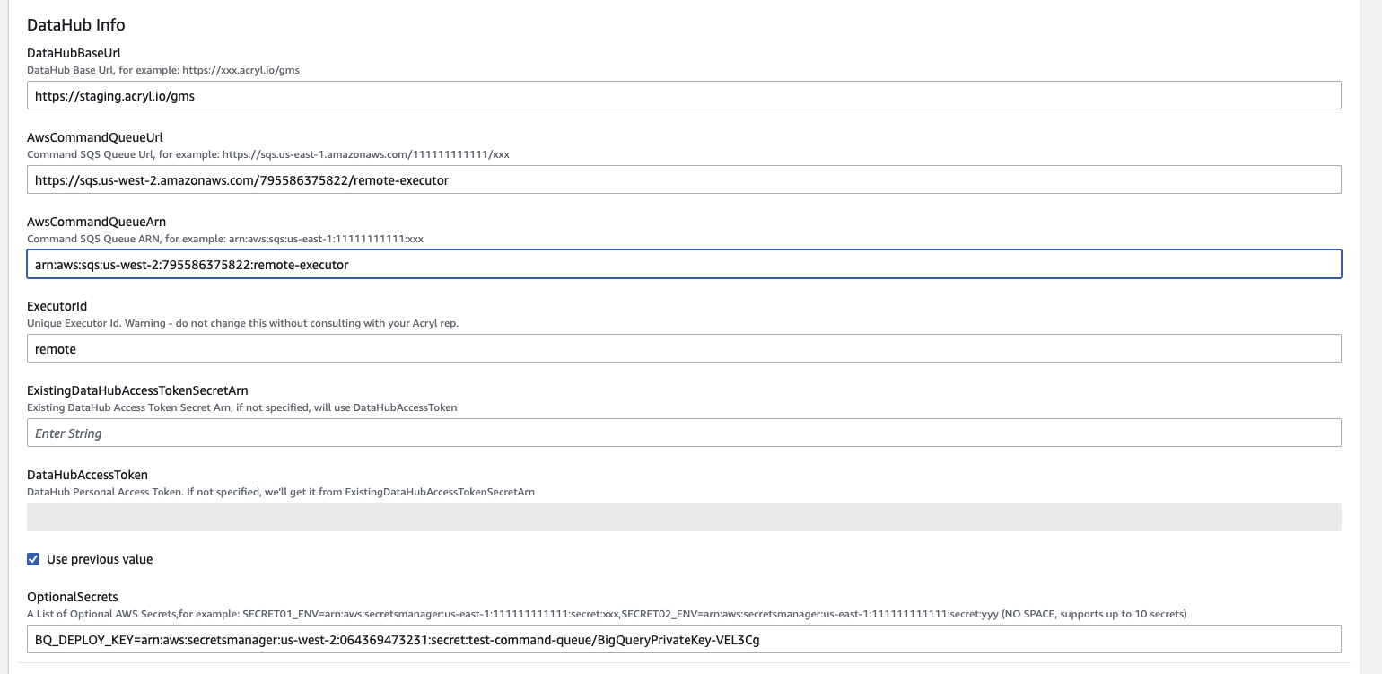 2. Provision an Acryl Executor (ECS): Acryl team will provide a Cloudformation Template that you can run to provision an ECS cluster with a single remote ingestion task. It will also provision an AWS role for the task which grants the permissions necessary to read and delete from the private SQS queue created for you, along with reading the secrets you've specified. At minimum, the template requires the following parameters: