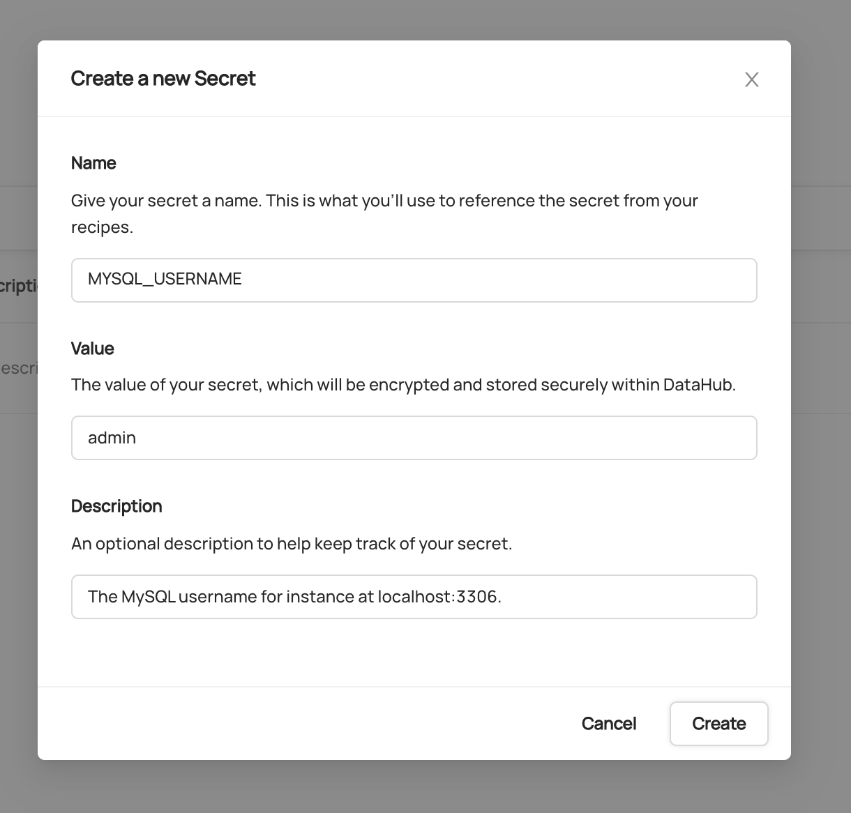 Inside the form, provide a unique name for the secret along with the value to be encrypted, and an optional description. Click Create when you are done. This will create a Secret which can be referenced inside your ingestion recipe using its name.