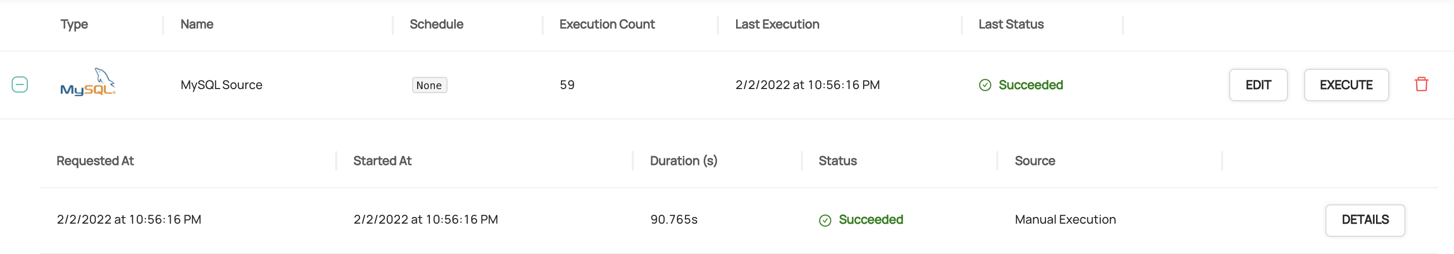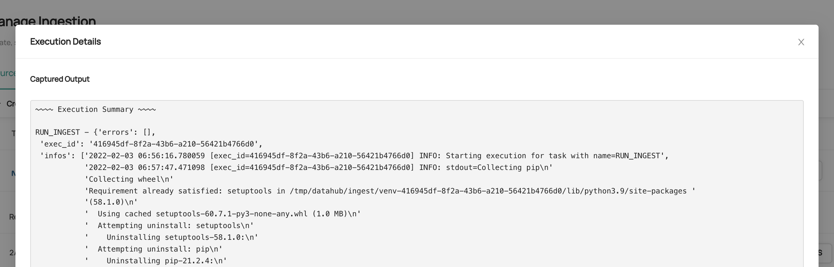 The output of each run is captured and available to view in the UI for easier debugging. To view output logs, click DETAILS on the corresponding ingestion run.