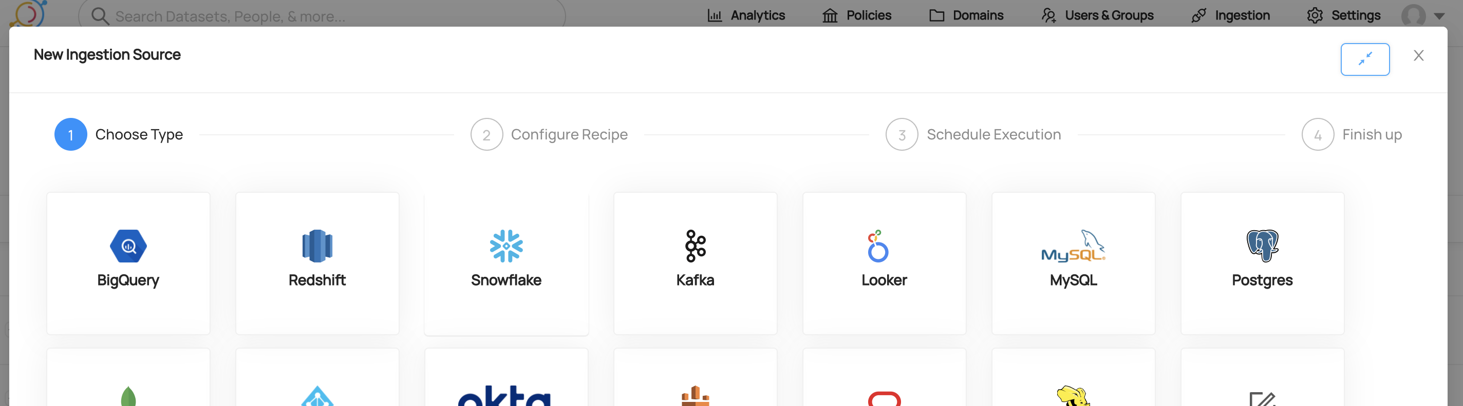 Next, you'll configure an ingestion Recipe, which defines how and what to extract from the source system.